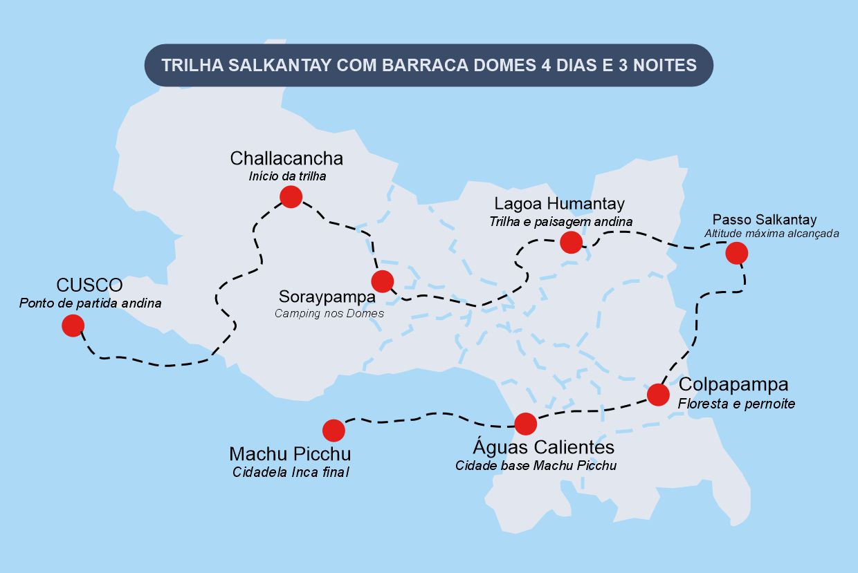 Abrace a aventura na Trilha Salkantay de 4 Dias e 3 Noites, uma experiência que une paisagens épicas, cultura e o conforto de Sky Domes. Partindo de Cusco, o primeiro dia o leva por vales pitorescos até o inovador acampamento em Soraypampa, coroado por um pôr do sol mágico na Laguna Humantay.